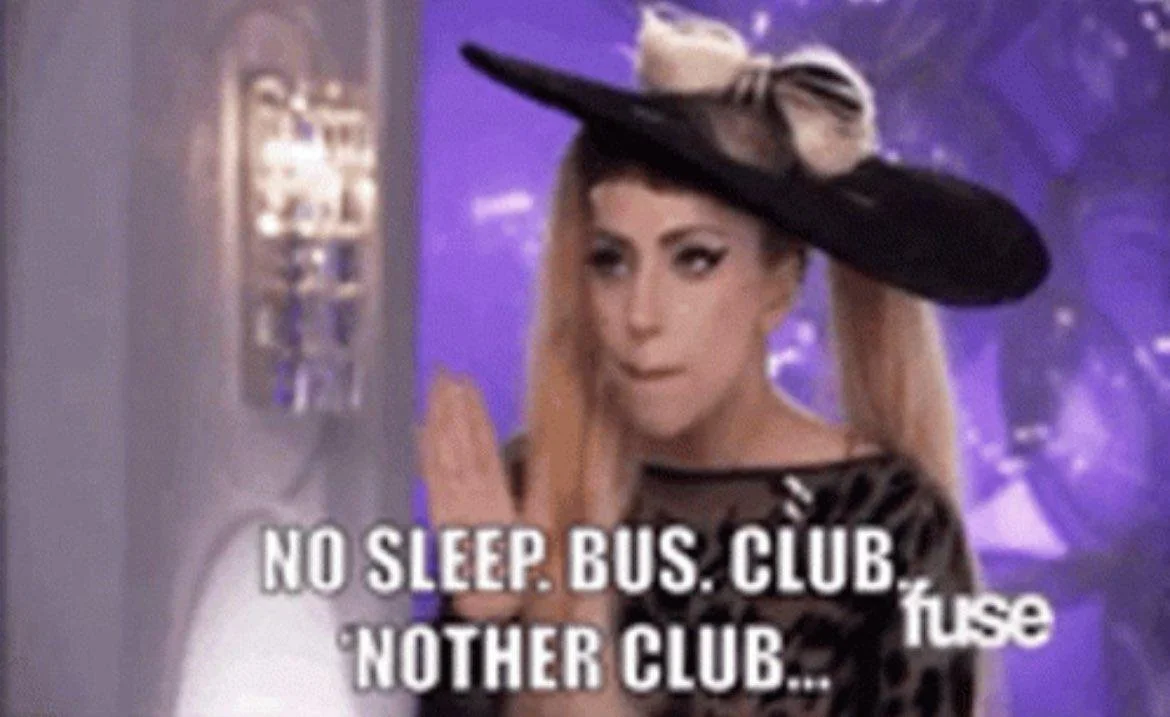 NO SLEEP. BUS. CLUB. 'NOTHER CLUB. PLANE.
